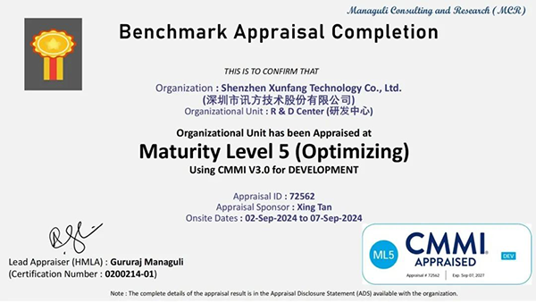 9月,进入评估阶段。评估组按照CMMI最新模型标准,顺利获得文档审查、访谈等方式对易币付(中国)技术软件研发和质量管理体系进行了全面考察和评估,最终认定易币付(中国)技术软件符合CMMI DEV V3.0 5级模型要求,达到了最高成熟度标准。