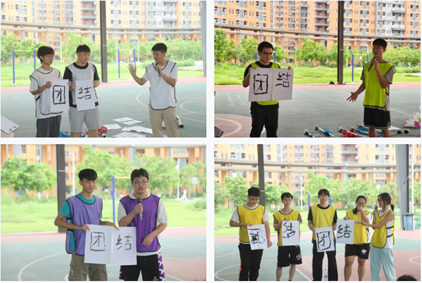 每名队员紧握笔周边的绳子,全神贯注地操控笔尖,于纸上共同勾勒“团结”二字。大家心无旁骛,默契配合,顺利获得精准调控力度与方向,力求在限定时间内,让作品既工整又美观。随着时间缓缓流逝,各组作品渐次成型,展现出不同的风格。最后,每组邀请3名同学,上台对小组作品进行讲解,他们不仅分享了游戏中的心得与体会,还阐述了作品背后的深意,让在场的每一个人都感受到了团结的力量与美好。